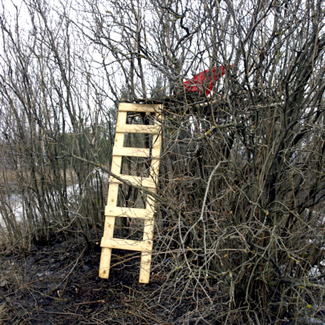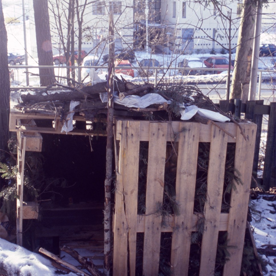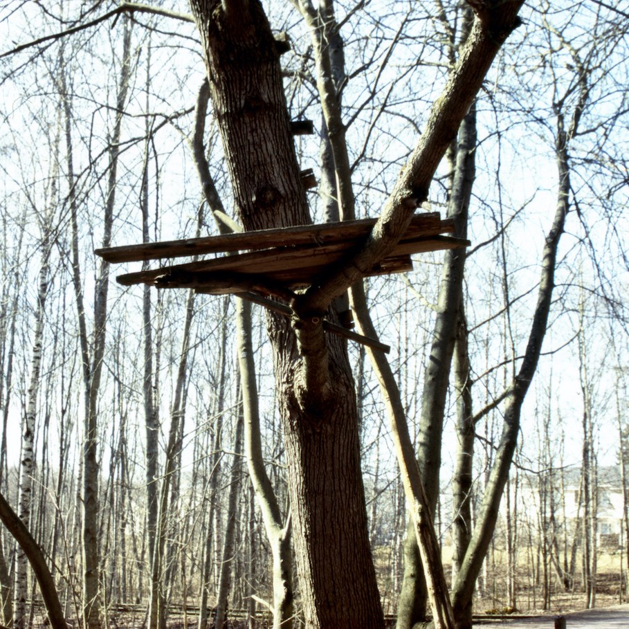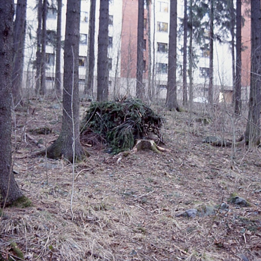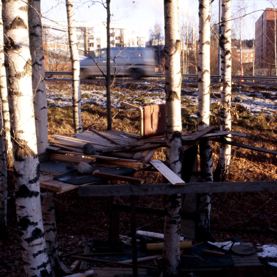 Huts in their variety have woken up my curiosity. Huts are places of imagination, imaginary buildings, spontaneous constructions to play in and with. Interesting is the relation between huts and the constructed environment, children’s relation to the built environment, how kids take their place or are let to take their place, how much space there is to invent. Huts I have mostly found in the suburbs wandering, also kids find their way to the woods close to suburbs, to thickets behind garages and to wastelands, which are free zones spiritually, abandoned in their feel. Photographing huts I have found picturing a carefree state, picturing freedom of imagining, detachment, independence, otherness and outsiderness, even though those characteristics wouldn’t be reasons for making a playground with a hut. They are to my mind images of one’s soul, natural constructions using intuition, private hideaways, dreamy and sudden, ideas to place oneself in, utopias, nests, shelters and just places of play etc. Building a hut is a process which end-result is surprising bringing feeling of success and joy of having made and been able to realize ideas of one’s own. Charming is the effortlessness how imaginary world is built from simple materials nearby without a ready-given plan and money.