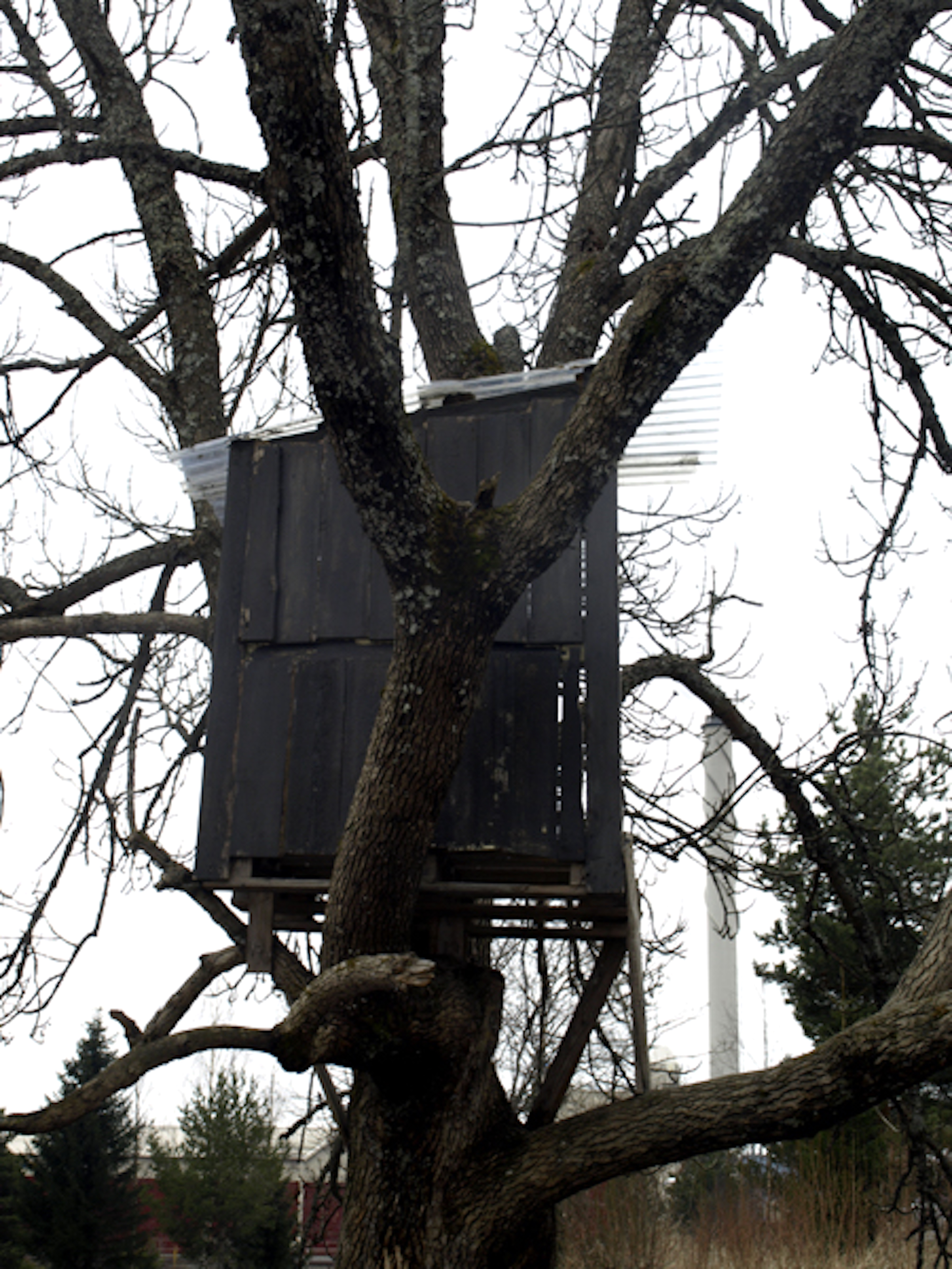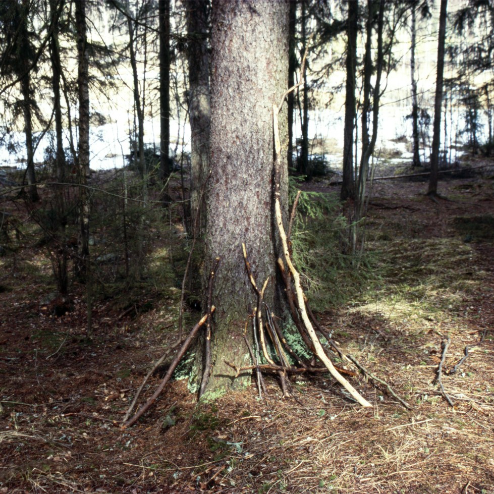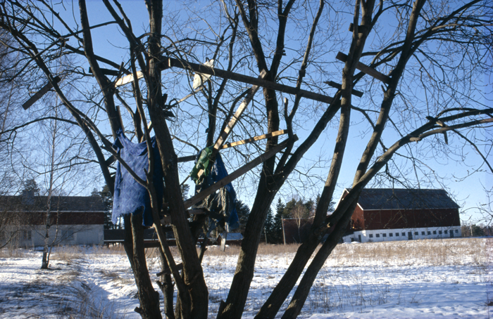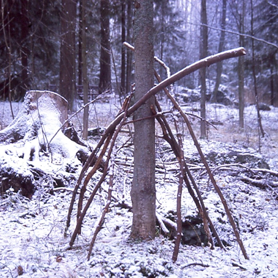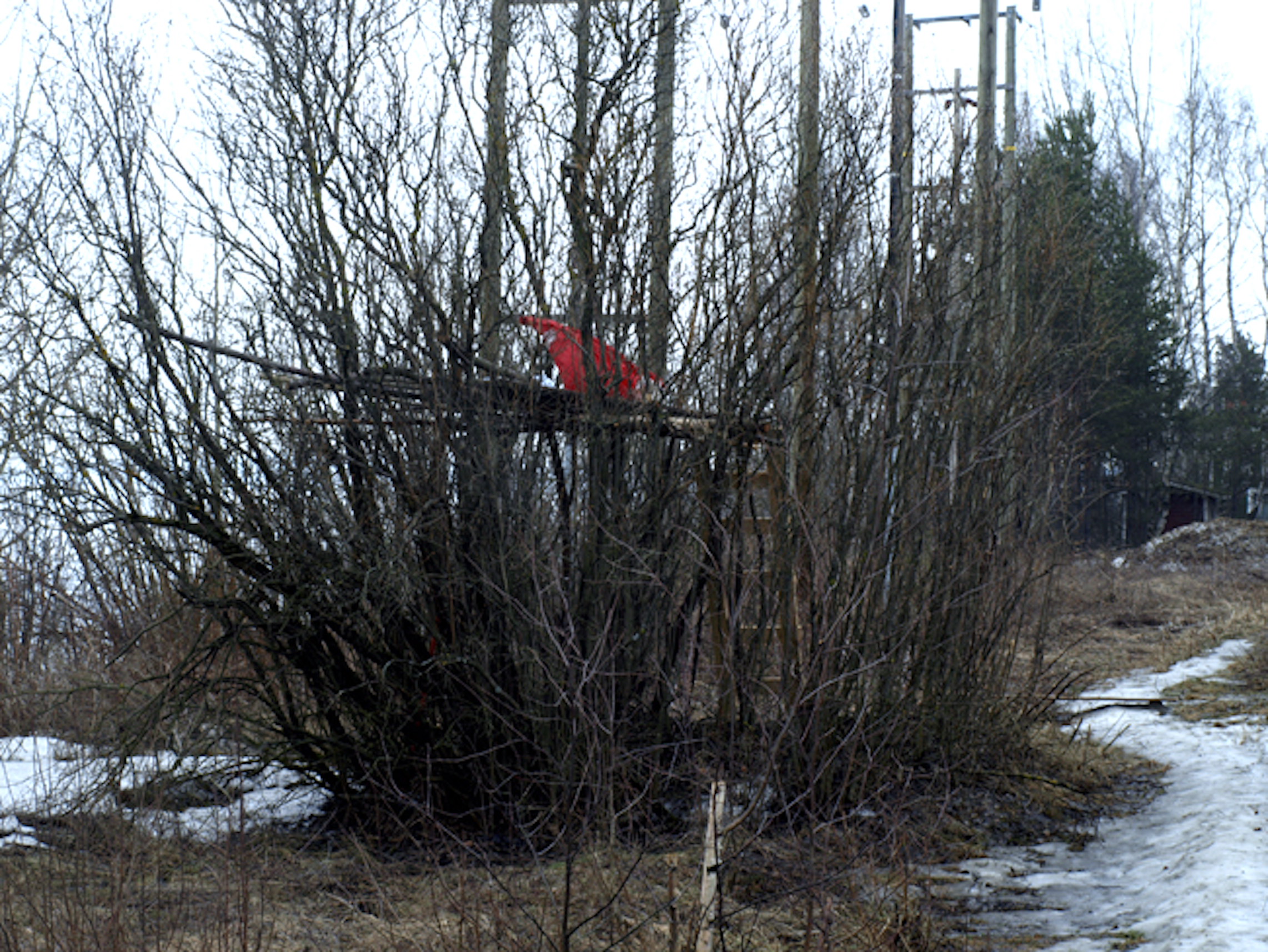 Huts in their variety have woken up my curiosity. Huts are places of imagination, imaginary buildings, spontaneous constructions to play in and with. Interesting is the relation between huts and the constructed environment, children’s relation to the built environment, how kids take their place or are let to take their place, how much space there is to invent. Huts I have mostly found in the suburbs wandering, also kids find their way to the woods close to suburbs, to thickets behind garages and to wastelands, which are free zones spiritually, abandoned in their feel. Photographing huts I have found picturing a carefree state, picturing freedom of imagining, detachment, independence, otherness and outsiderness, even though those characteristics wouldn’t be reasons for making a playground with a hut. They are to my mind images of one’s soul, natural constructions using intuition, private hideaways, dreamy and sudden, ideas to place oneself in, utopias, nests, shelters and just places of play etc. Building a hut is a process which end-result is surprising bringing feeling of success and joy of having made and been able to realize ideas of one’s own. Charming is the effortlessness how imaginary world is built from simple materials nearby without a ready-given plan and money.
