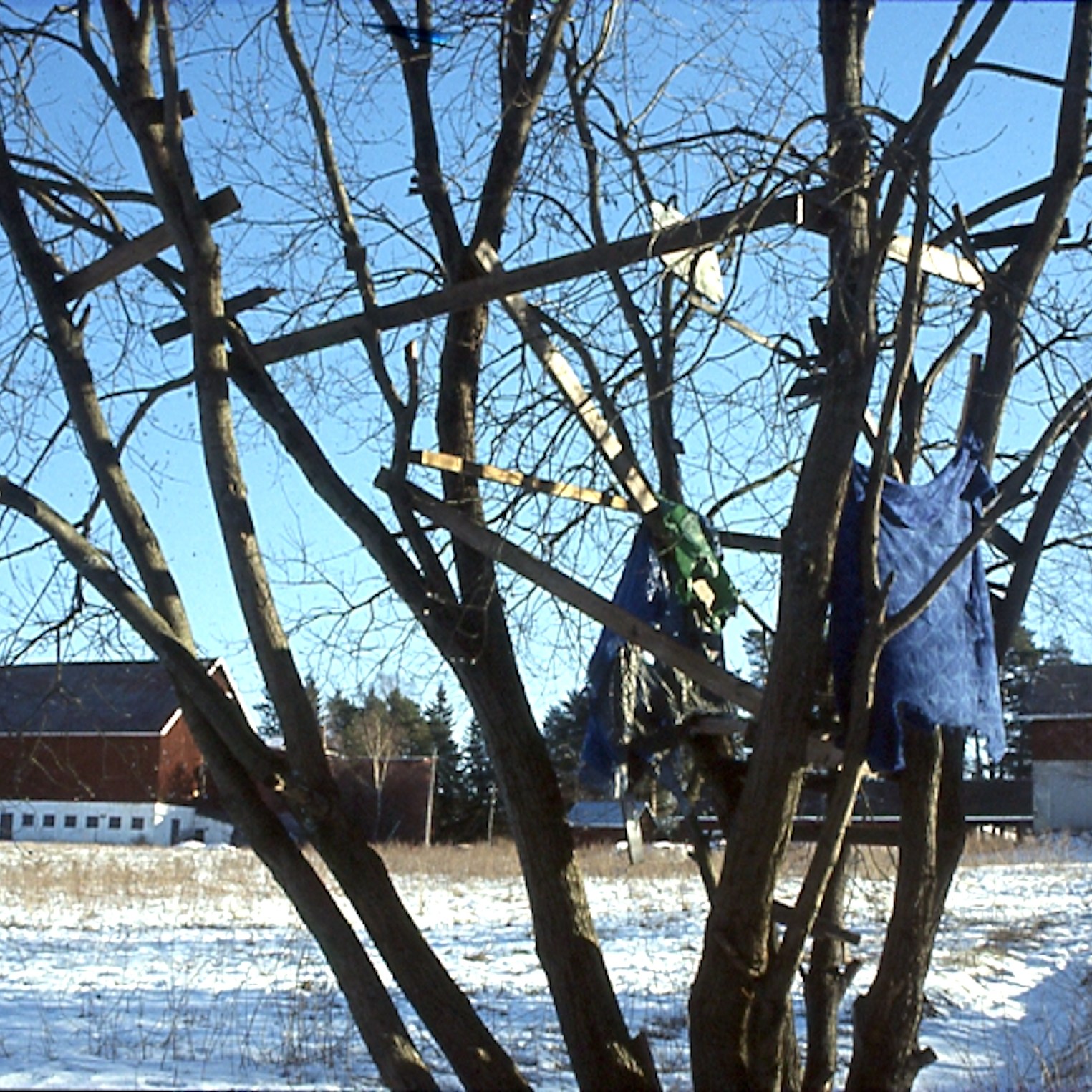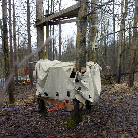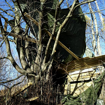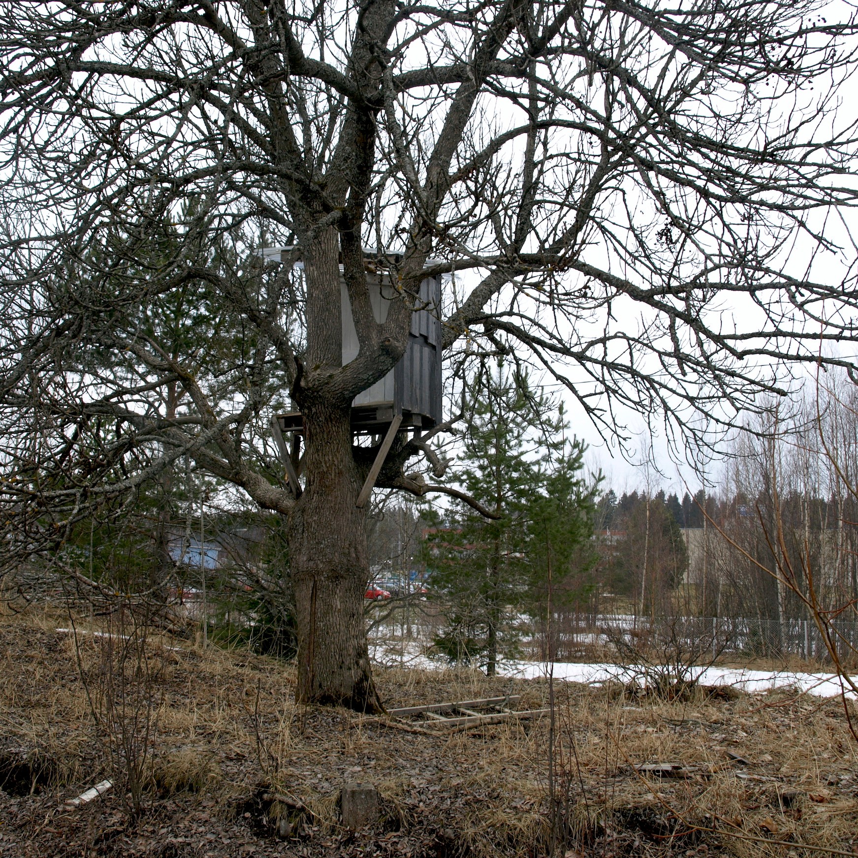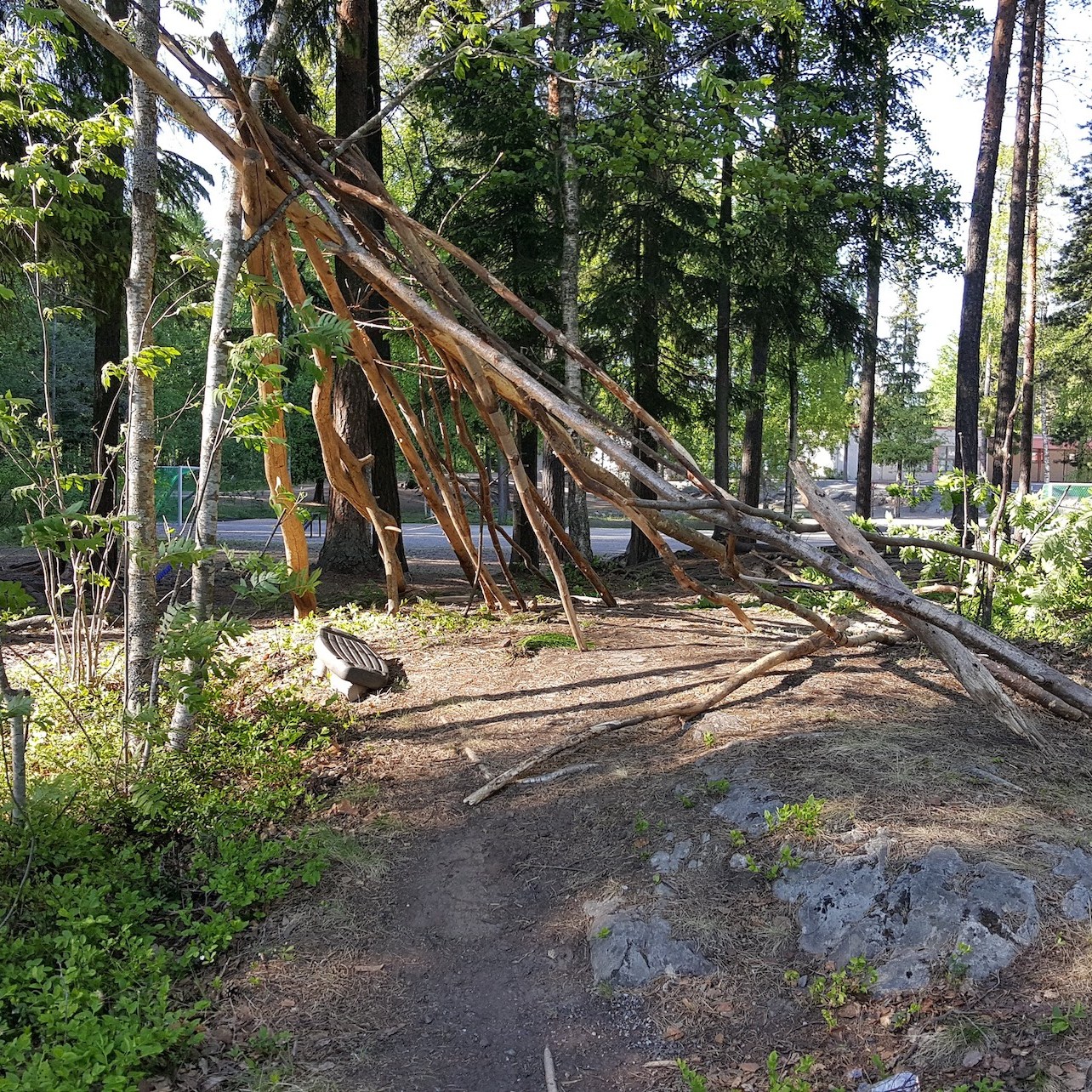 Huts in their variety have woken up my curiosity. Huts are places of imagination, imaginary buildings, spontaneous constructions to play in and with. Interesting is the relation between huts and the constructed environment, children’s relation to the built environment, how kids take their place or are let to take their place, how much space there is to invent. Huts I have mostly found in the suburbs wandering, also kids find their way to the woods close to suburbs, to thickets behind garages and to wastelands, which are free zones spiritually, abandoned in their feel. Photographing huts I have found picturing a carefree state, picturing freedom of imagining, detachment, independence, otherness and outsiderness, even though those characteristics wouldn’t be reasons for making a playground with a hut. They are to my mind images of one’s soul, natural constructions using intuition, private hideaways, dreamy and sudden, ideas to place oneself in, utopias, nests, shelters and just places of play etc. Building a hut is a process which end-result is surprising bringing feeling of success and joy of having made and been able to realize ideas of one’s own. Charming is the effortlessness how imaginary world is built from simple materials nearby without a ready-given plan and money.