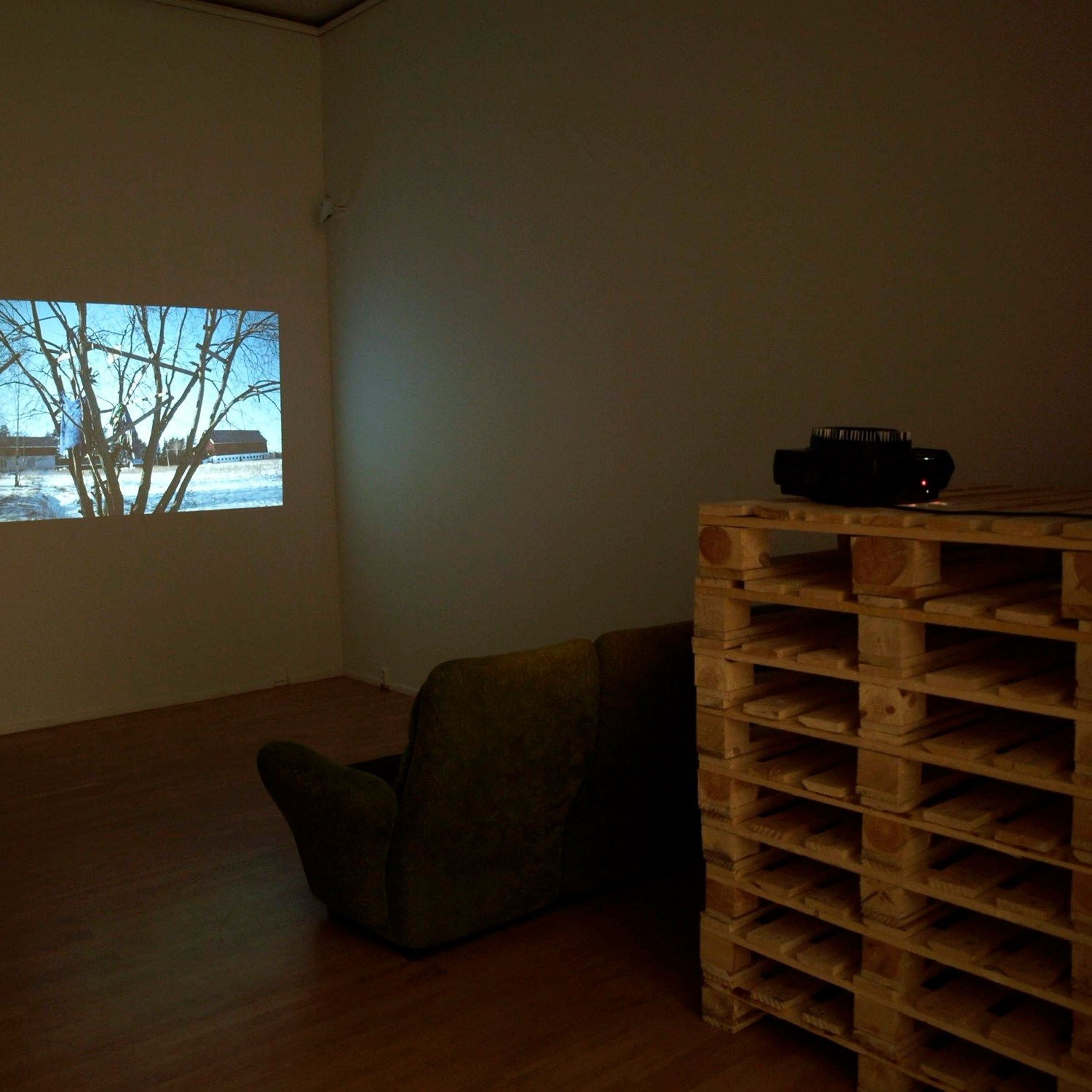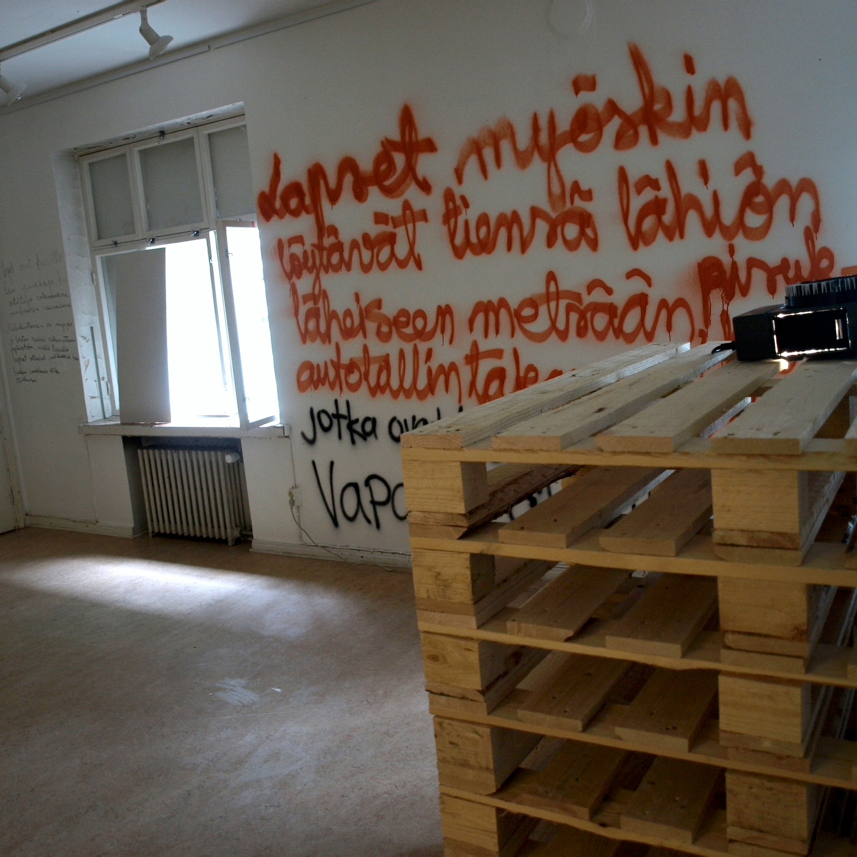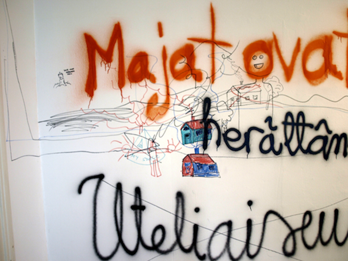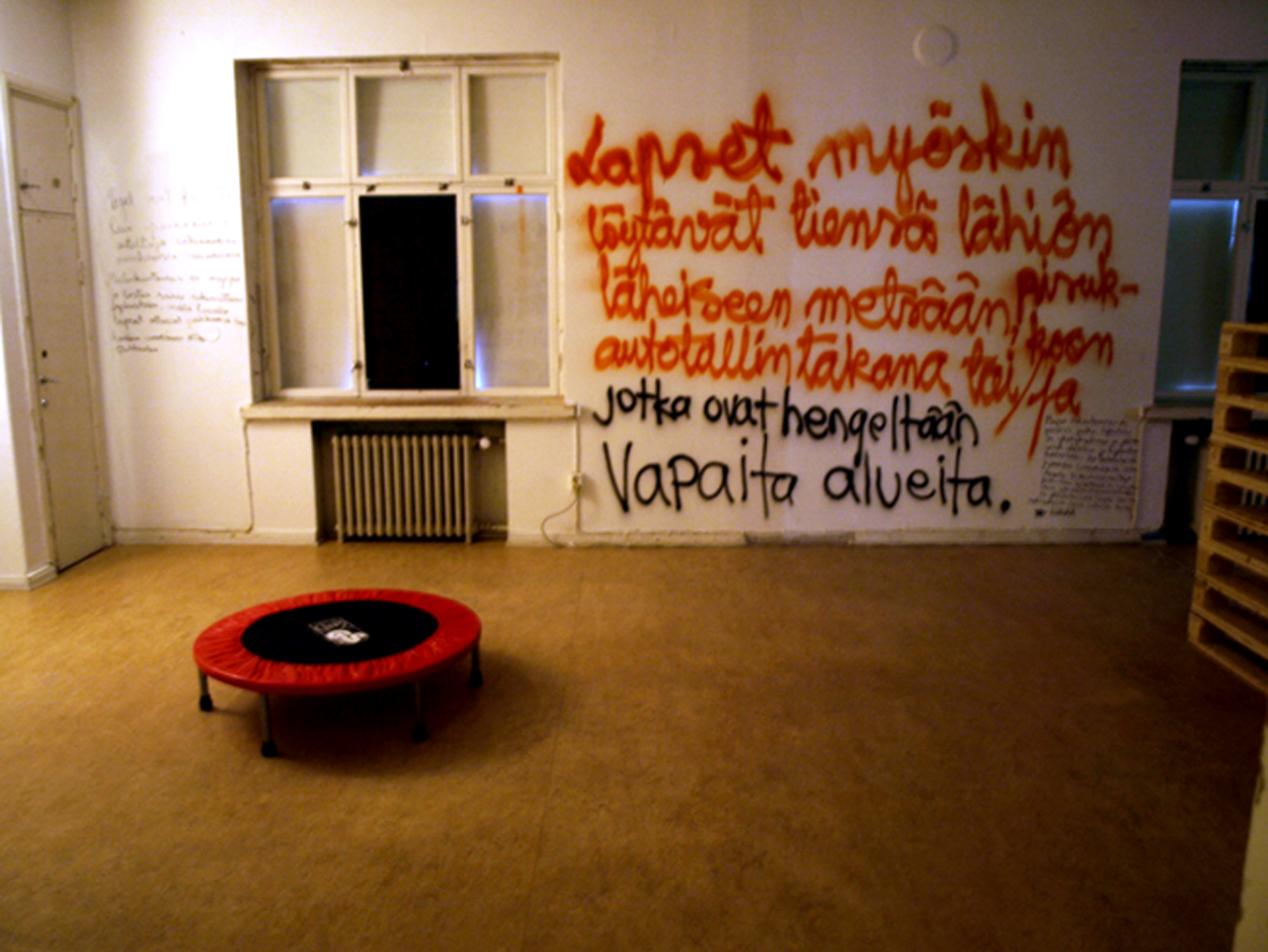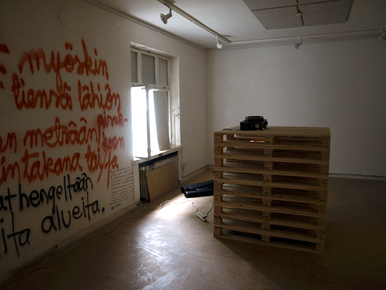 Images (80 dia slides in a carousel projector constantly rolling) from the exhibition 2012 in Pori in gallery 3h+k. With sofa and trampoline. After having written my text on the wall, I let the visitors draw and write what they wanted on the walls. On this slideshow I have added huts filmed with phone and digital camera.