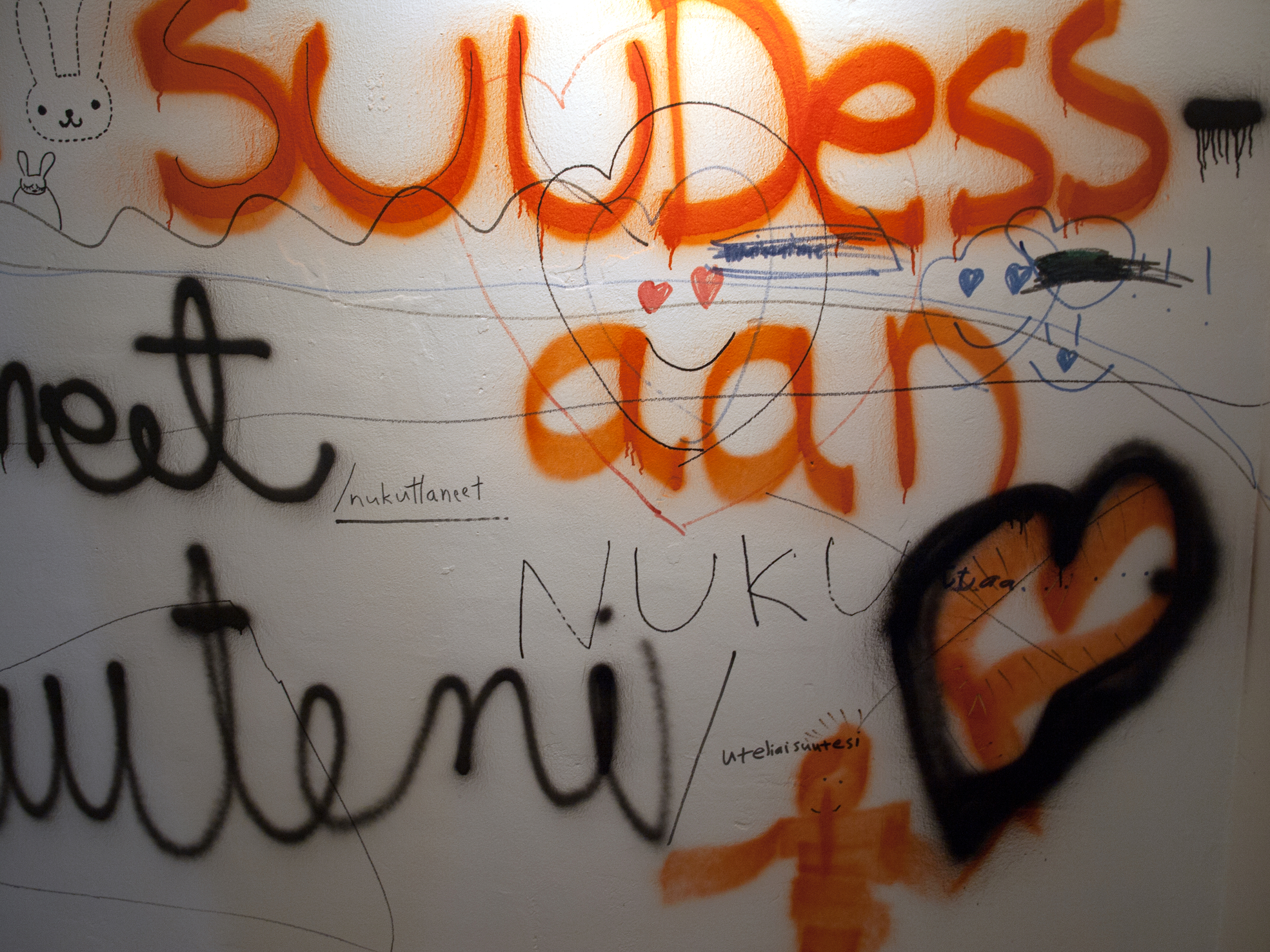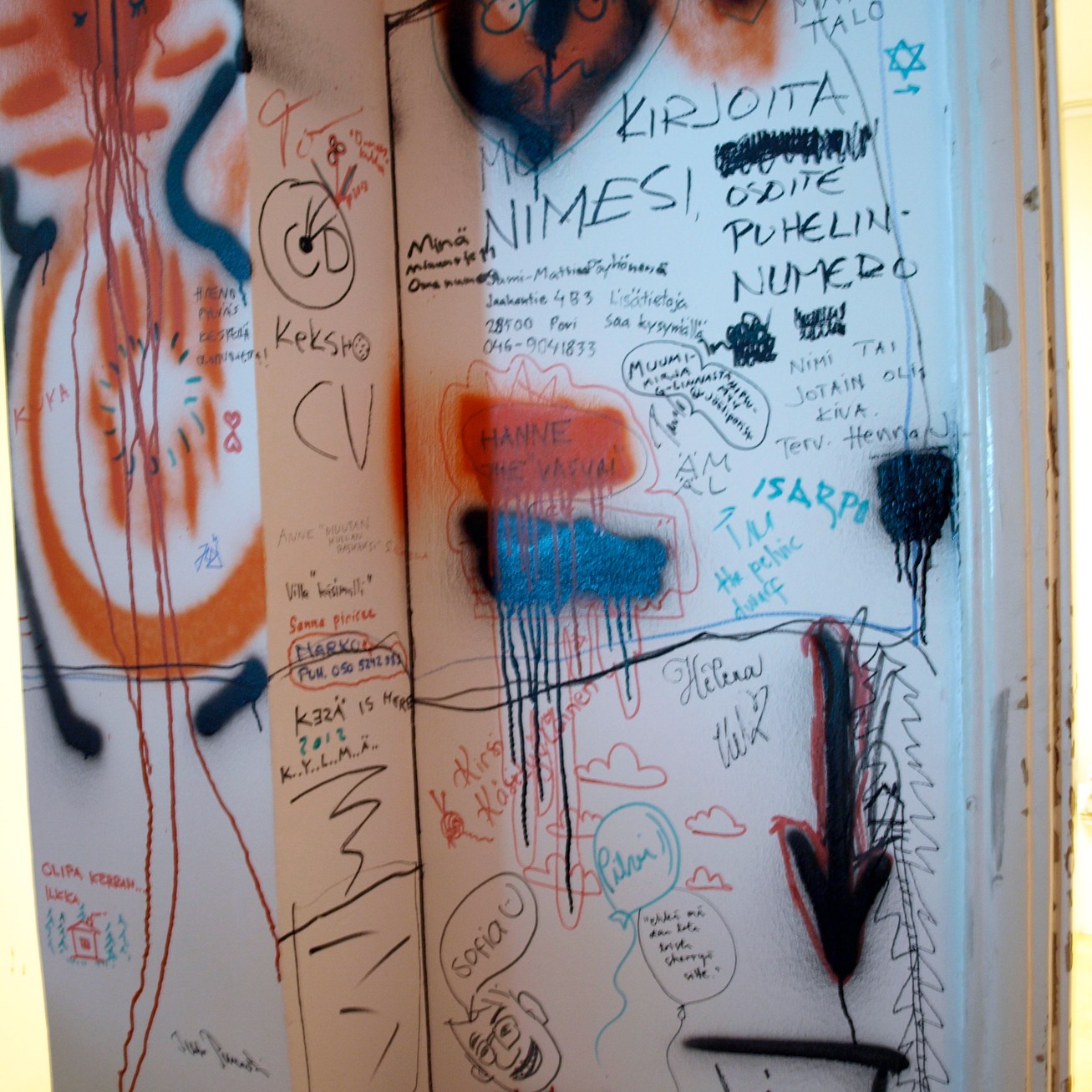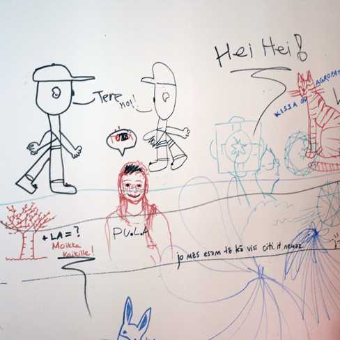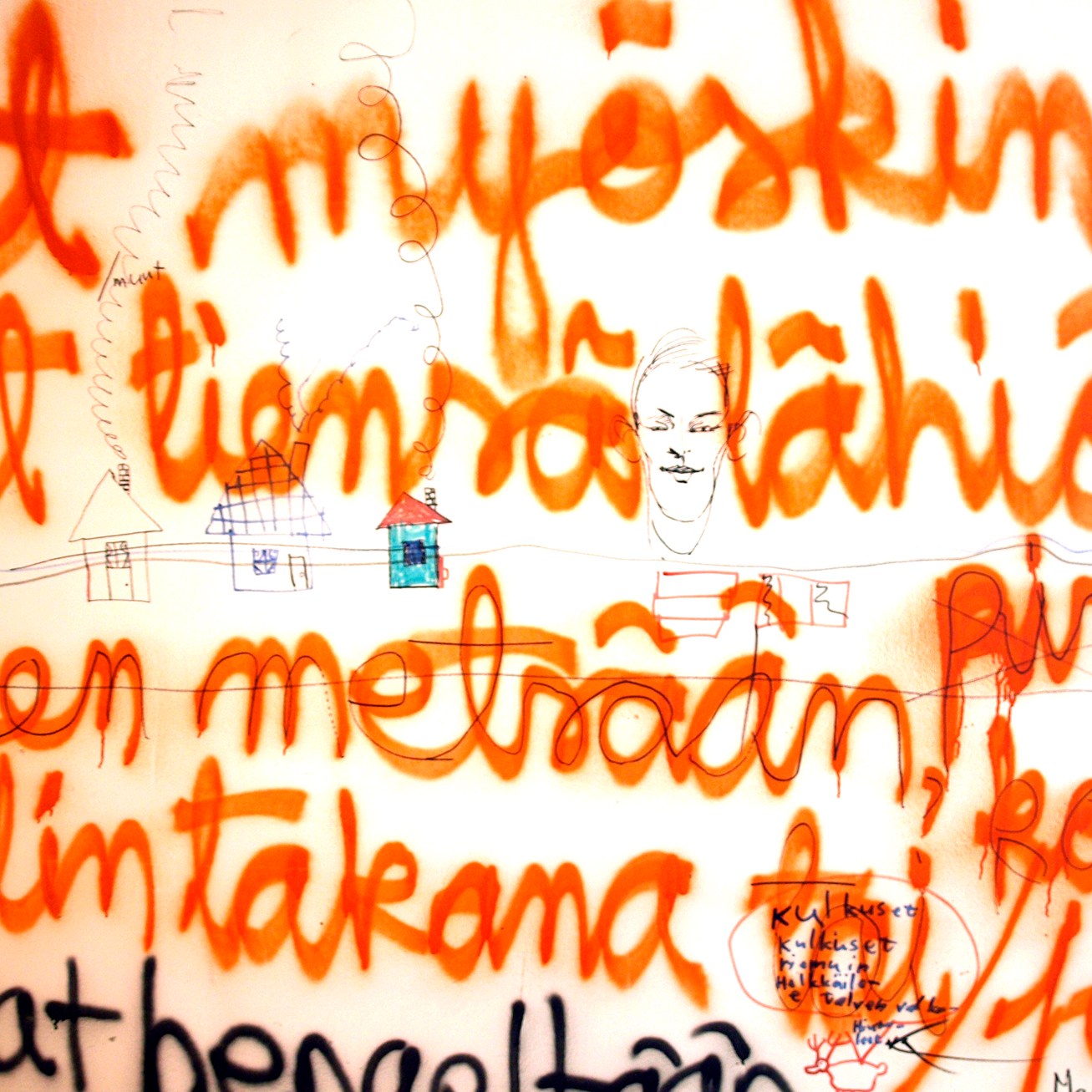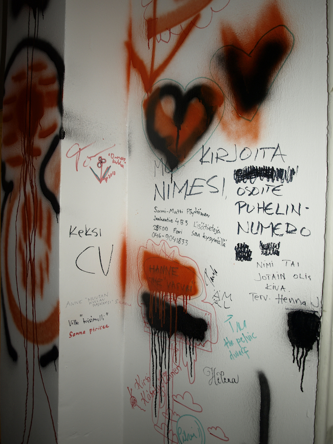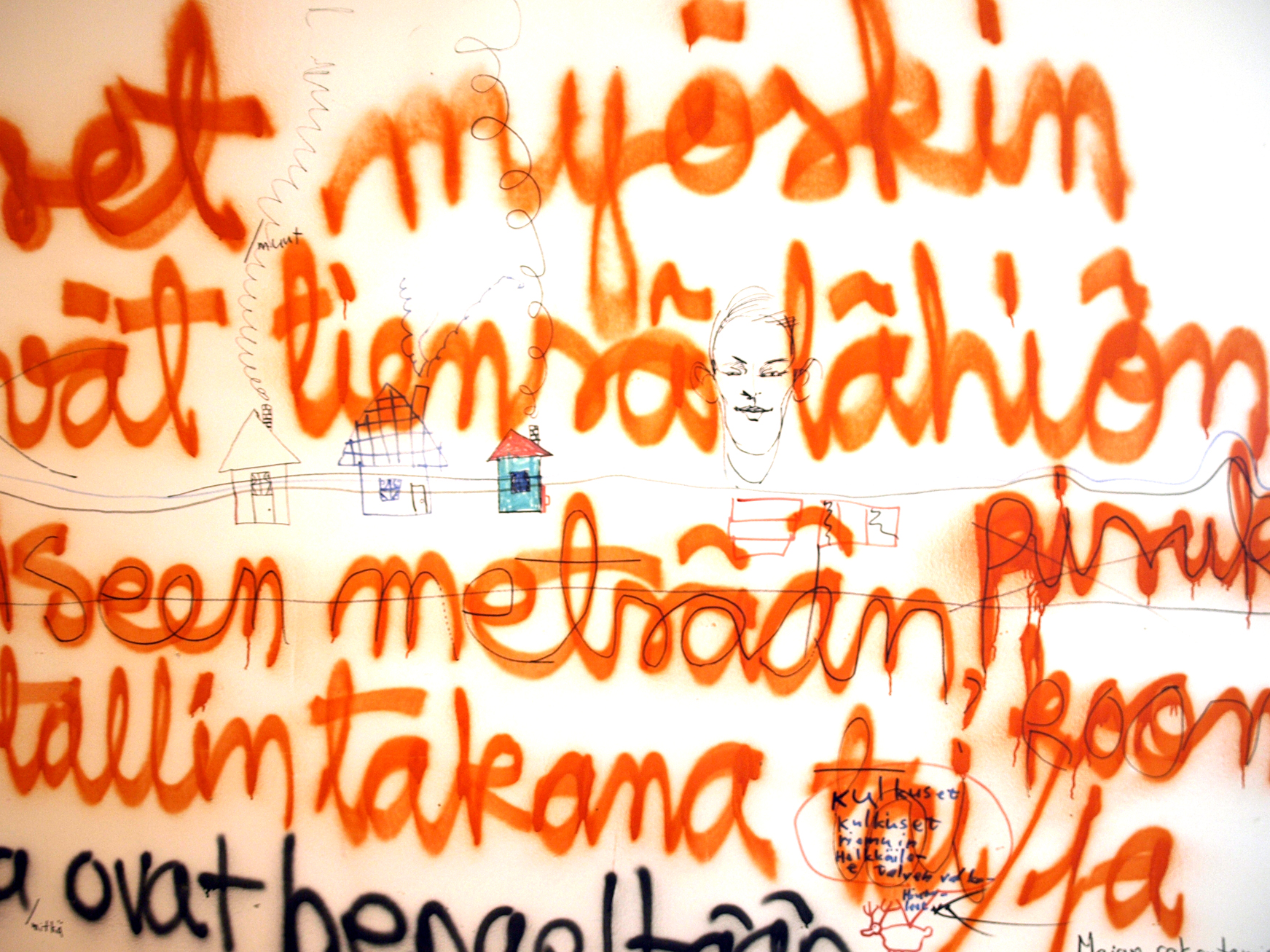 Images (80 dia slides in a carousel projector constantly rolling) from the exhibition 2012 in Pori in gallery 3h+k. With sofa and trampoline. After having written my text on the wall, I let the visitors draw and write what they wanted on the walls. On this slideshow I have added huts filmed with phone and digital camera.