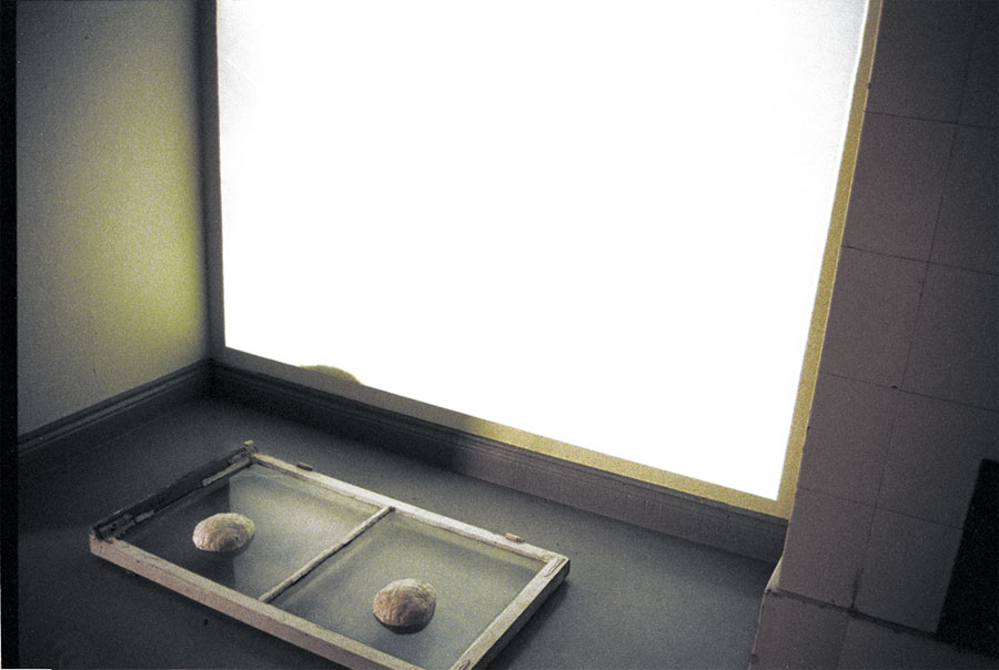 Rakkauden ekstaasi, diakuvainstallaatio (80 kuvaa), keraamiset käsinrakennetut päälaet ja lantioluut ikkunoiden päällä, video saippuakuplien puhaltamisesta, 2000