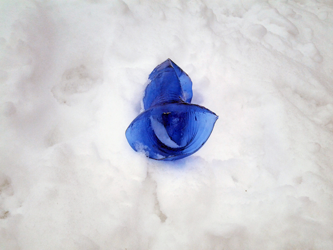 Trampoline on a yard covered with snow, a grey house and on its wall said Enchantment.