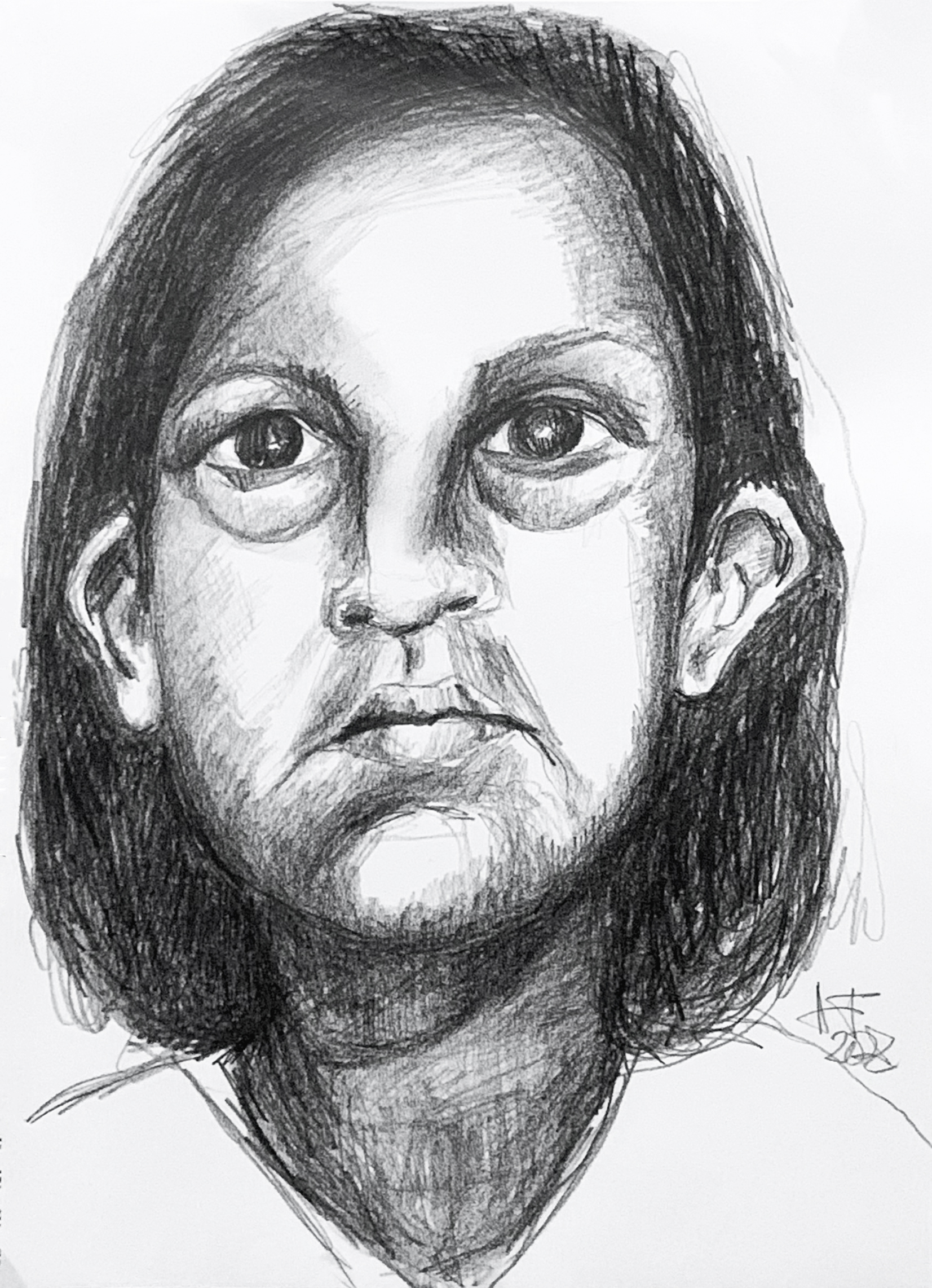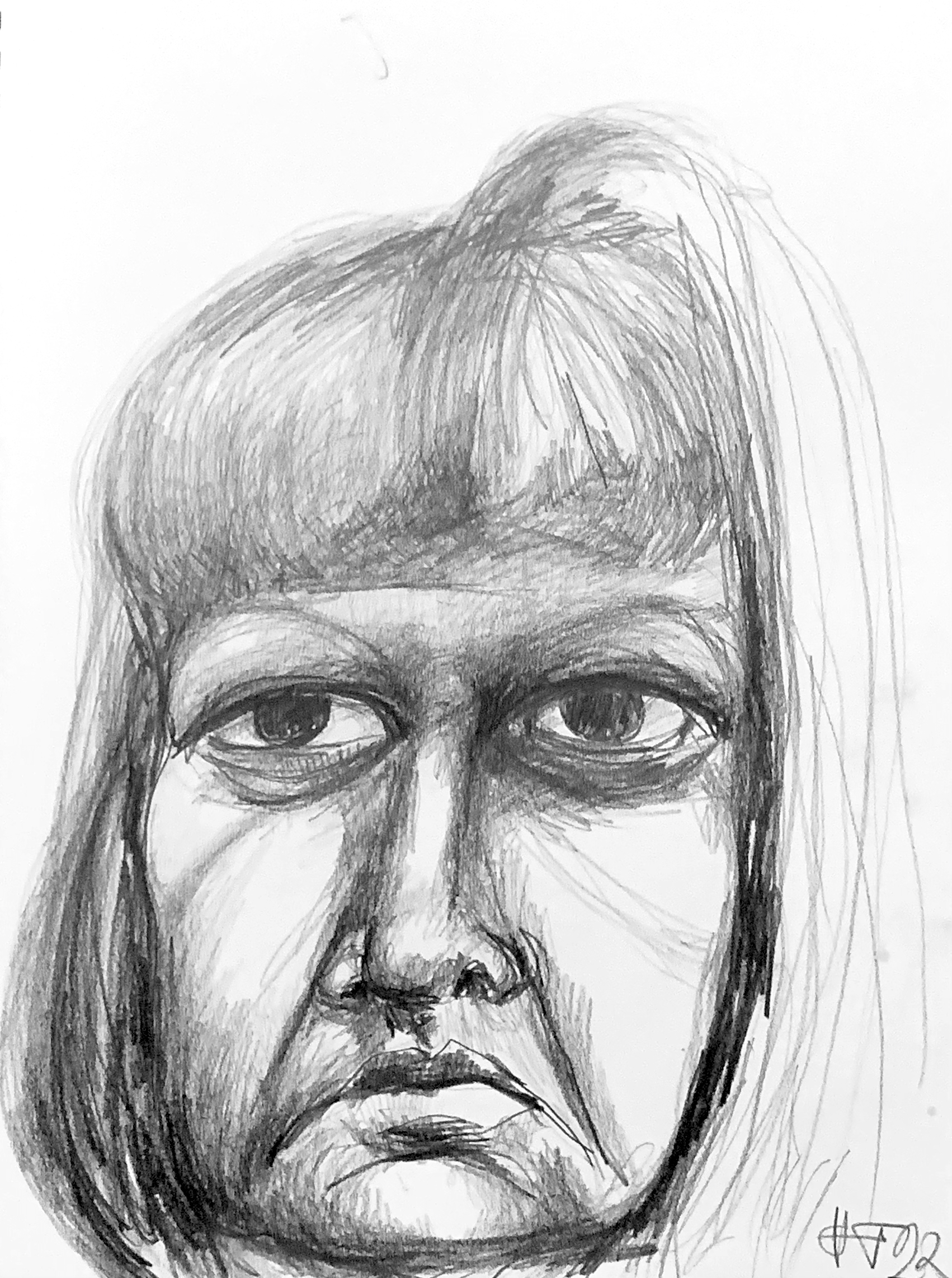 Killer, 2021- from online mugshots of women, an ongoing process of drawings and paintings, pencil on paper and acrylic on canvas. Depicting the changing face, controlled and uncontrolled, interested in the unmanipulated face, face turning into something else virtually, mess of pigment but reminding of human. Are we erasing the human or is human the brutal and violent that remains? Painting process which doesn’t try to achieve perfection of the face, the painting is not perfect, face is what it is. Image is a testing site as seems to be human him- and herself. Dangers there how we ‘evolve’ and our image is altered are known, we are losing trust, losing the natural face, aging process is something that makes us unworthy, youth, which is a competition, maybe that is why dangerous female criminals found themselves on my canvas, usually having killed a husband, they have destroyed their own lives and taken a life, which brutality I find online, which it is, a dangerous place in many ways to our minds and societies as a whole, people hiding as someone else.