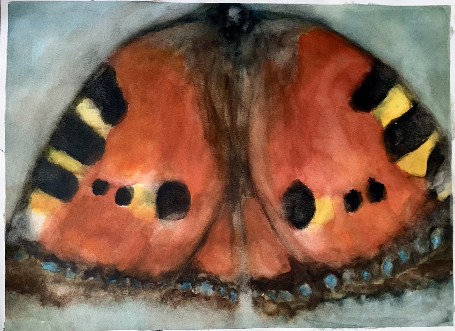 Studies on butterfly, noctuid, dragonfly, bumble bee and other insects found dead and their parts on paper with gouache, watercolour and colouring pen. Pigment on the wings that gets stuck on one’s fingers.